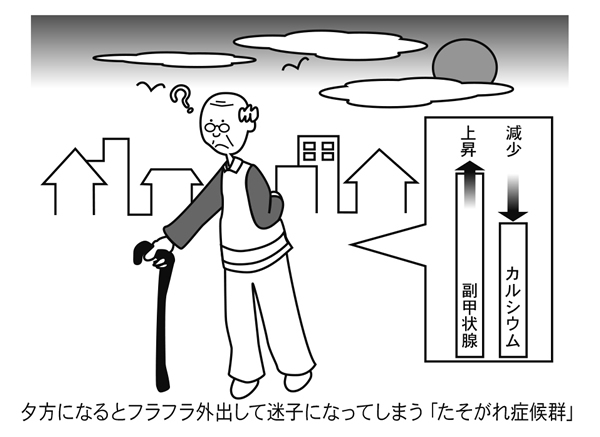 認知症に関してもう一つ困ることは、夕方になると落ちつかなくなり、外出しても迷子になって、交通事故に遭ったりすることです。これを「たそがれ症候群」といいます。治療・入院中にせっかく自由な時間を楽しんでもらおうと思っても、認知症病棟には鍵を掛けて閉鎖病棟にしなければならないのは、大変残念なことですが、事故を防ぐためには仕方のないことなのです。血液中のカルシウム濃度は、夕方になると少し下り、副甲状腺ホルモンが増えます。これが「たそがれ症候群」の原因の一つです。