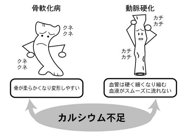 動脈は心臓から全身の各組織へ血液を送る管です。伸縮自在で、必要に応じて太くなったり細くなったりします。したがって、常にゴム管のように軟らかくなければなりません。動脈硬化というのは、軟らかいはずの動脈が硬くなることです。逆に、体を支えるために硬くなければならない骨が、軟らかくなってしまう病気を骨軟化症といいます。骨軟化症は、カルシウムやビタミンDの不足によって骨のカルシウムが減り、骨の石灰化が不十分になることです。反対に、動脈硬化は、カルシウムが動脈にたくさんついて、骨のように硬くなってしまうことです。日本の老年医学の開拓者である尼子富士郎博士(1893〜1972年)は、かつて浴風会病院で老人の献体解剖をした際に、大動脈が骨のようにポキポキ折れるほど硬くなっている多くの症例に接し、その謎を解明するために老人病の研究を志した、という話が知られています。