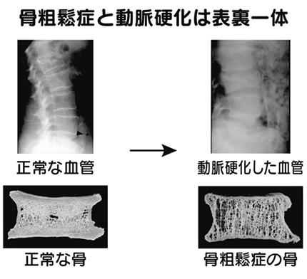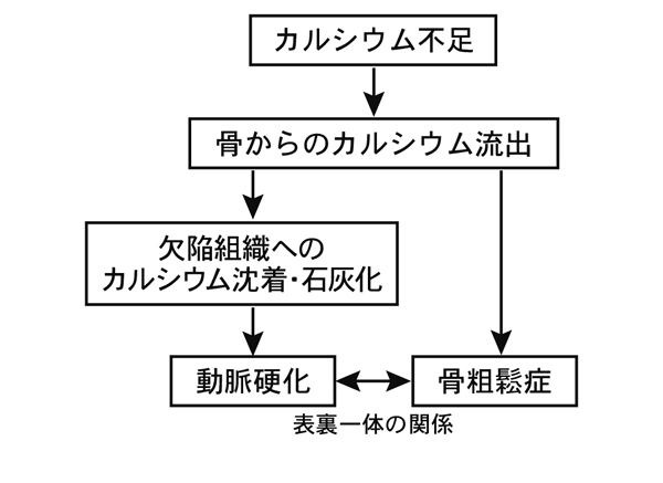 血管の組織にカルシウムが増えると、当然、血管は硬く狭くなります。これが動脈硬化です。硬い血管は狭くて血液が通りにくく、しかもカルシウムが血管を硬くし、自由な収縮を妨げるので、血圧も上がります。事実、カルシウムの摂り方が不足している人では高血圧や動脈硬化が多く、カルシウムを十分に摂ると快方に向かうことが、わかっています。また、明らかにカルシウム不足で起こる骨粗鬆症は、動脈へのカルシウム沈着と一緒に起こることが、100年以上も前から知られています。最近では高速断層撮影(CT)という新しい方法によって、カルシウムやビタミンDの不足している人に冠動脈の石灰化(心臓に血液を送り込む冠状動脈の動脈硬化)が多いこともわかっています。その意味で、骨粗鬆症と動脈硬化は、カルシウム不足を原因とした、表裏一体の関係にあると言えましょう。