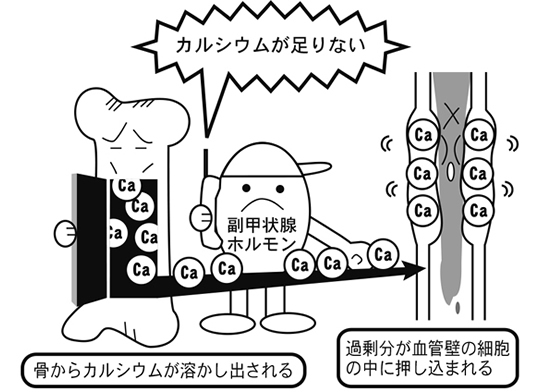 カルシウムの摂り方が足りないと、まず、血液中のカルシウムが減ります。これは大切な情報として、副甲状腺(甲状腺の後にある米粒のような4個の器官)という内分泌腺に伝えられ、その結果、副甲状腺ホルモンが分泌されます。副甲状腺ホルモンの大切な仕事は、骨に働きかけ、骨からカルシウムを取り出して血液中に移動させ、血液中のカルシウム濃度を一定に維持することです。ところがカルシウム不足が慢性的になっていると、生命を維持するために常に骨からカルシウムが溶かし出されるので、ご存知のように骨粗鬆症になりますが、それだけではありません。副甲状腺ホルモンがいつもたくさん出ていると、必要以上に多くのカルシウムが溶かし出され、過剰分は行くところがなくなって血管や脳や軟骨、各細胞の中など、通常はカルシウムが侵入禁止になっている組織にまで押し込まれてしまうのです。