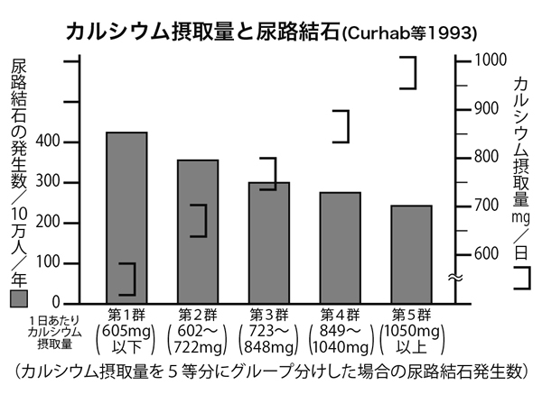 カルシウムパラドックスの一番わかりやすく、しかも誤解されている例は、結石でしょう。結石は、カルシウムの摂り過ぎから起こると思われがちですが、実際は全く反対、その原因はカルシウム不足なのです。ハーバード大学のカーハン教授は、カルシウム摂取と腎臓結石の発症の関係について十数年間追跡調査しました。その結果、カルシウム摂取の少ない人に腎臓結石ができやすく、十分な人にはできにくいことがわかりました。