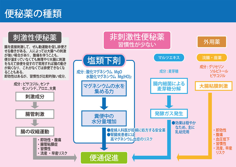 それに対して、非刺激性便秘薬は刺激成分を含まない便秘薬です。塩類下剤といわれるものが多く、代表的なのものは酸化マグネシウム、水酸化マグネシウムです。これらはマグネシウム(塩類)の浸透圧を利用して、腸に水分を集め、排便を促す便秘薬です。刺激成分を含まないので、腹痛も伴いにくく、また服用量が増えたり、クセになったりすることがないのが、大きな特徴です。そのほか、腸内細菌による麦芽糖分解で発酵ガスを発生させることによって排便を促す便秘薬もあります。