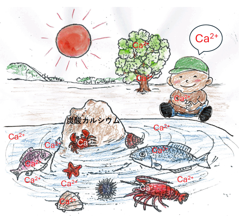 【イラスト:工藤佳久 】 海水にはカルシウムイオン(Ca2+)が含まれており、多くの生物の生命を生み出し育んでいる。人間を含めた陸生動物には血液中に必要な量のカルシウムイオンを保つ仕組みが備わっている。