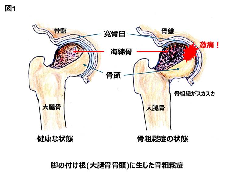 図1 大腿骨上部の骨頭は見事な球形です。この球形の部分が骨盤に造られた丸い穴、寛骨臼(かんこつきゅう)にピタリとハマります。骨頭には軟骨(コラーゲン)の膜が張り付いており、寛骨臼の内側にも軟骨が張り付いていますので非常に滑らかに動きます。しかし、上半身を左右の大腿骨で支えるのですから、骨頭部が骨粗鬆症に陥ると、変形したり、崩れたりします。この状態に陥ると激しい痛みが生じます。