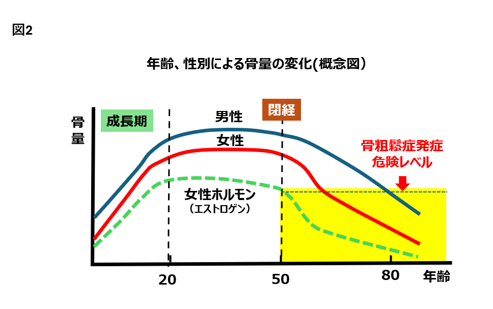 女性が骨粗鬆症に罹る原因は、男性の骨粗鬆症患者に見られる生活習慣的なものとは性質が異なるのです。まず、子供を産むこと、そして授乳をすることで激しくカルシウムが費やされ、十分に摂ったと思っても不足している場合が多いのです。それでもこの時期にはカルシウムの吸収を高める女性ホルモンの一つであるエストロゲンが十分に分泌されるので、それほどの問題はないのです。ところが、閉経後の女性はエストロゲンが急激に減少してしまうのです。そのためにカルシウムの吸収が低下し、カルシウム不足になりやすくなるのです。エストロゲンが減少すると、「破骨細胞」の働きが活発になり、「骨芽細胞」の働きが追いつかなくなるのです。当然、骨量が減少します。女性の場合、閉経後、骨密度は急激に低下することが知られています (図2)。